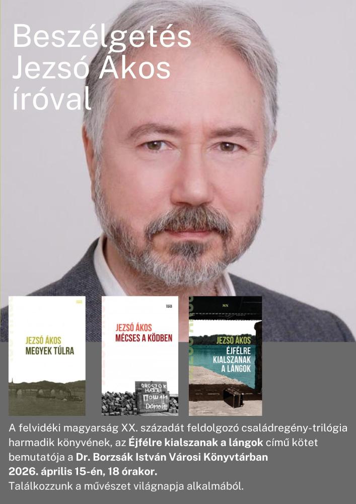 A művészet világnapján, április 15-én (szerdán) 18.00 órára szeretettel hívjuk Önöket JEZSÓ ÁKOS iró "Éjfélre kialszanak a lángok" című kötetének bemutatójára. A kötet a felvidéki magyarság XX. századát feldolgozó családregény-trilógia harmadik könyve.