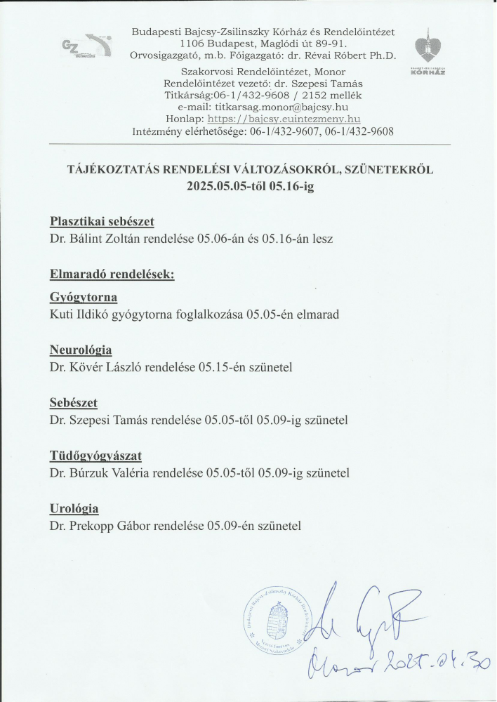 Rendelési idő változás május 5-től május 16-ig