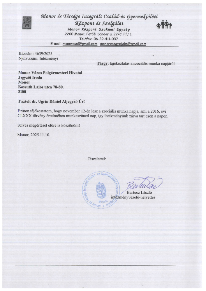 2025. november 12-én a Monor és Térsége Integrált Családi-és Gyermekjóléti Központ és Szolgálat zárva tart