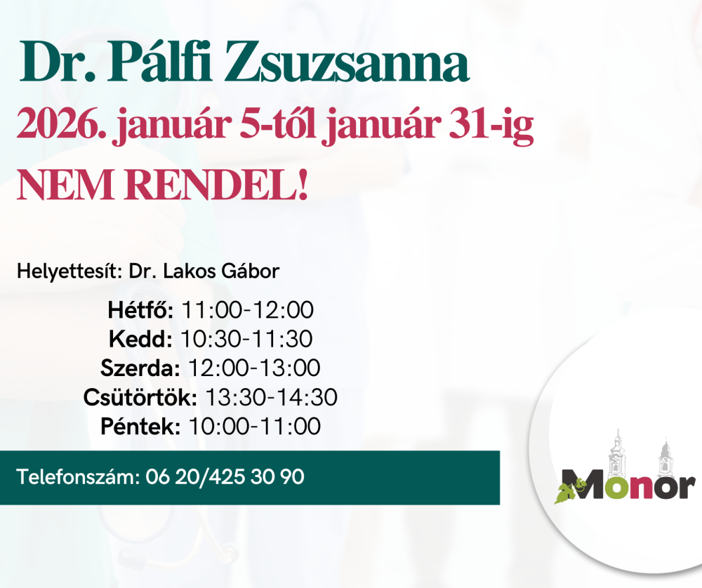 2026. január 5-től január 31-ig Dr. Pálfi Zsuzsanna rendelése szünetel. Dr. Lakos Gábor az alábbi időpontokban helyettesíti.