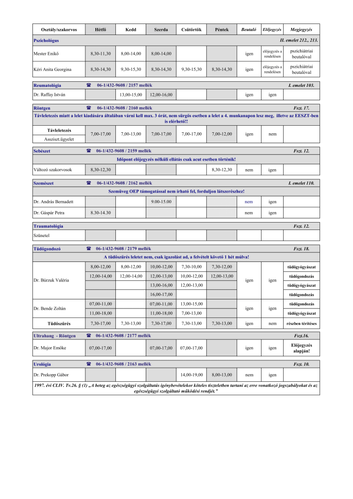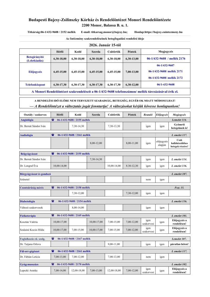 Aktuális rendelési idők január 15-től