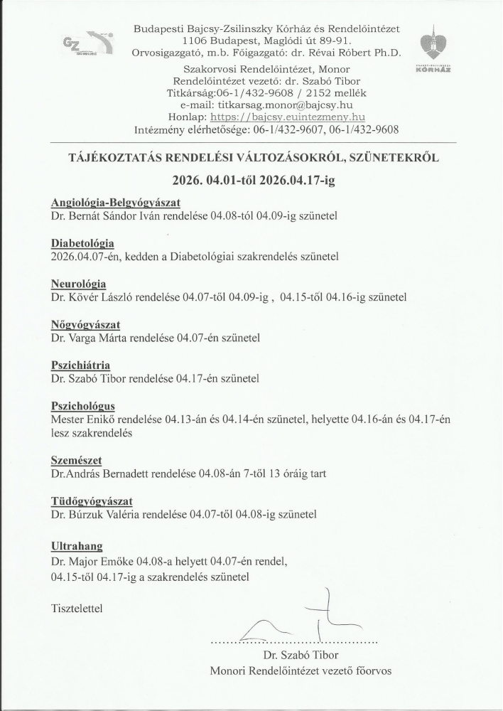 Rendelési idő változás április 1. és április 17. között