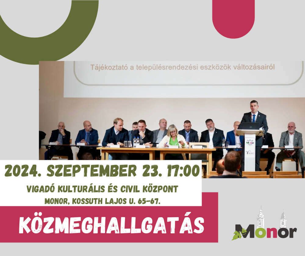 Monor Város Önkormányzatának Képviselő-testülete az általa tartandó közmeghallgatás időpontját 2022. október 24. napján (hétfő) 17 órai kezdési időponttal határozza meg. Helyszín: Vigadó Kulturális és Civil Központ Díszterme (2200 Monor, Kossuth Lajos u. 65-67.)